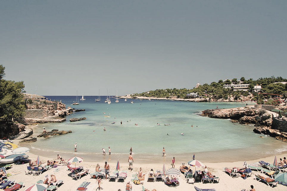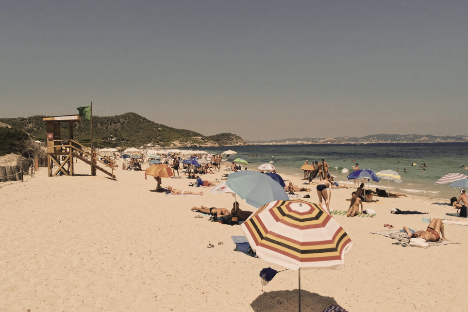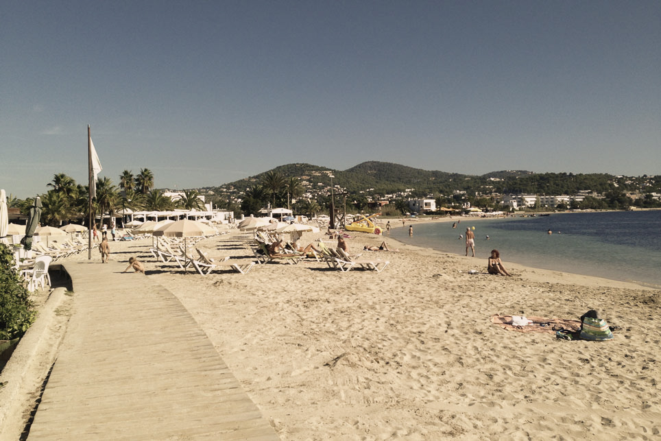 Playa de moda y sitio de encuentro de famosos. Forma parte del Parque Natural de ses Salines, un área fuertemente protegida por su elevado valor ecológico. Abierta y de considerable longitud, se encuentra rodeada de frondosos bosques de sabinas y pinos. Es muy popular por la transparencia de sus aguas, la gran variedad de servicios que ofrece y su proximidad a la ciudad de Ibiza.